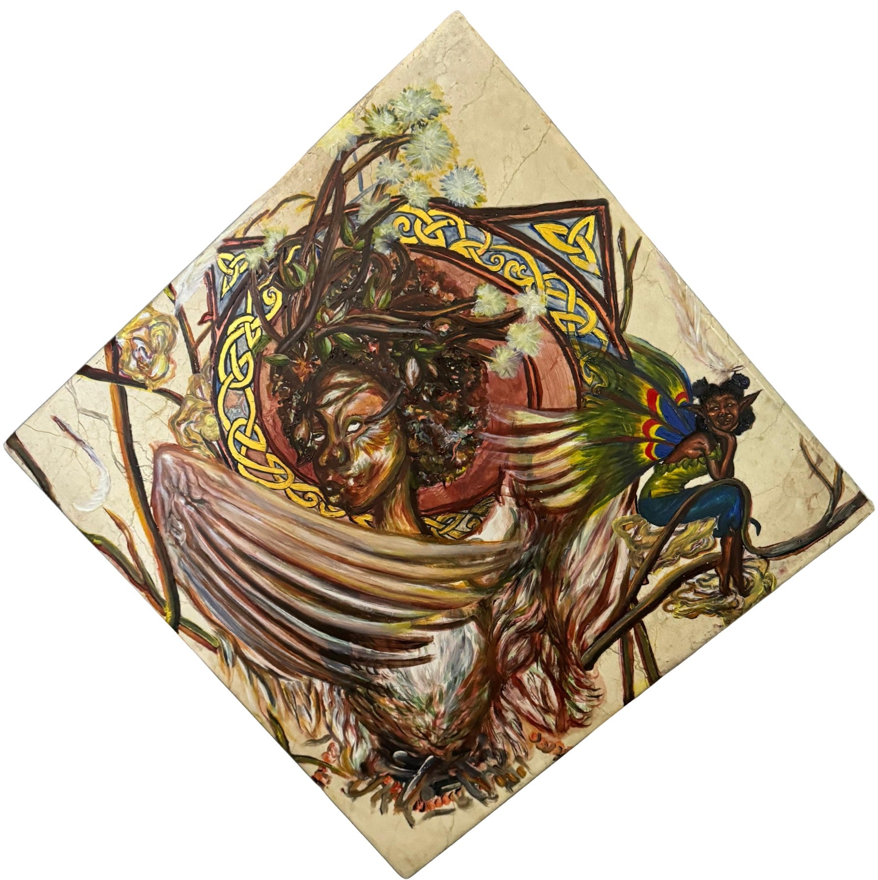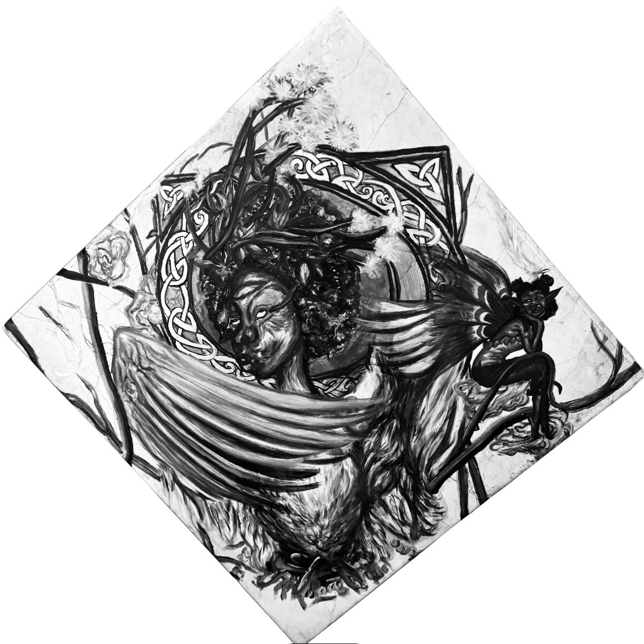 A fairy with wings in the colours of the Congolese flag is depicted, adding a layer of cultural significance. Behind, the symbol for the Celtic harvest moon connects to themes of renewal and abundance. The intricate, mythical elements within the composition highlight the storytelling aspect of my artistic expression, celebrating the journey and evolution of my creative identity.